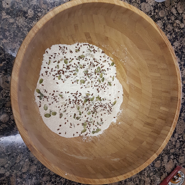2. Prepare the dry ingredients: In a large bowl, mix the flour, vital wheat gluten, salt, and seeds.