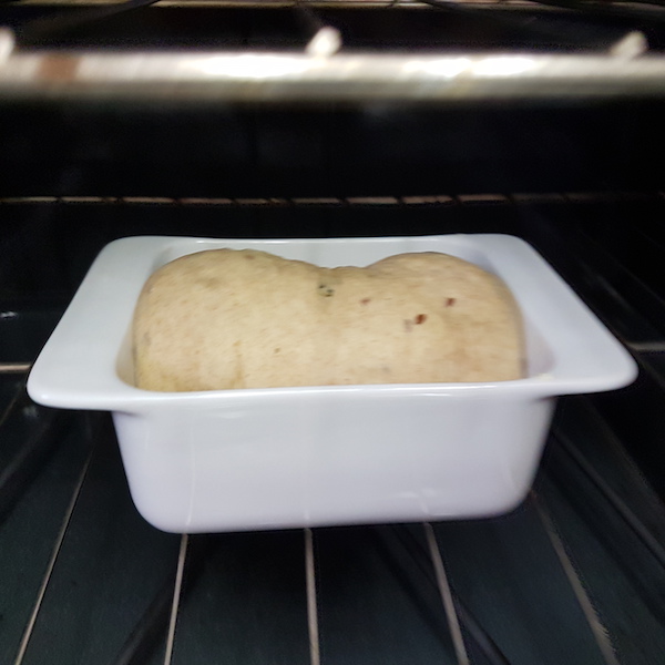 9. Apply butter liberally to all internal surfaces of the bread pan. This prevents the bread from sticking to the sides of the pan after it is baked. Place the dough into the pan and wait another 90 minutes or so until the dough doubles in volume. If the ambient temperature is not warm, heat the oven ever so slightly, then switch it off and place the pan in the oven. Keep it in the oven with door closed.