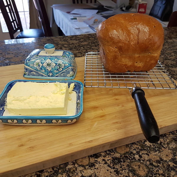 I have been experimenting with different recipes for a basic bread loaf to make at home without a bread machine. After many experiments, here is the one that works for me. It creates a fluffy, healthy loaf with good taste and lasts about 3 days.