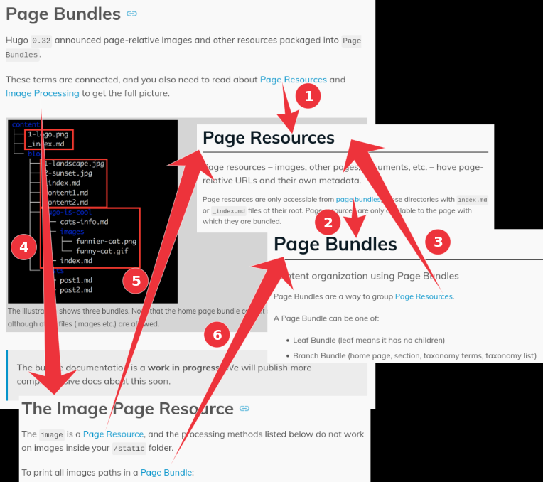 index.mdor_index.mdfiles at their root.” Great! So the hypothesis that a Page Bundle is a regular directory with some special content seems to be true. BUT.. to really know what a Page Bundle is, you now need to jump to the linked page about Page Bundles. - The Page Bundles page starts off by telling you that, “Page Bundles are a way to group Page Resources.” So hey, that’s a link back to the page we came from. At this point, we still don’t really understand what a Page Bundle is.. nor have we yet understood what Page Resources are. So maybe read this page, the previous page on Page Resources, and the original page we started from, to understand everything? But wait, we have not yet visited the Image Processing, which is one more unknown concept. Let’s do that first.