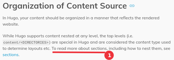 - “While Hugo supports content nested at any level, … .To read more about sections,..” Huh? What the heck is a “section”? How is a “section” related to what is being described? This page has literally never mentioned the word “section” so far and all of a sudden, seemingly with no reasoning, it is asking the reader to go to some other page to learn more about sections. This is an exemplary instance of Pattern 2. Yes, I could simply click the link and find out, but that’s going to be another rabbit hole. Let’s ignore this and continue reading the page.