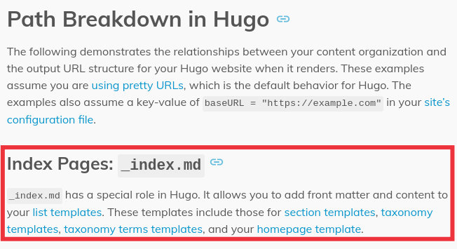 The documentation page now starts talking about a file named _index.md which has not been introduced before. The description of _index.md is that it “..has a special role in Hugo. It allows you to add frontmatter and content to your list templates. These templates include those for section templates, taxonomy templates, taxonomy terms templates, and your homepage template.” Argh! At this point, to understand what _index.md is actually useful for, maybe you need to understand what a list template is and maybe even what ‘section’, ’taxonomy’, ’taxonomy terms’ and ‘homepage’ templates are. The documentation has basically asked the user to read up on five new terms in order to understand what _index.md is useful for.
