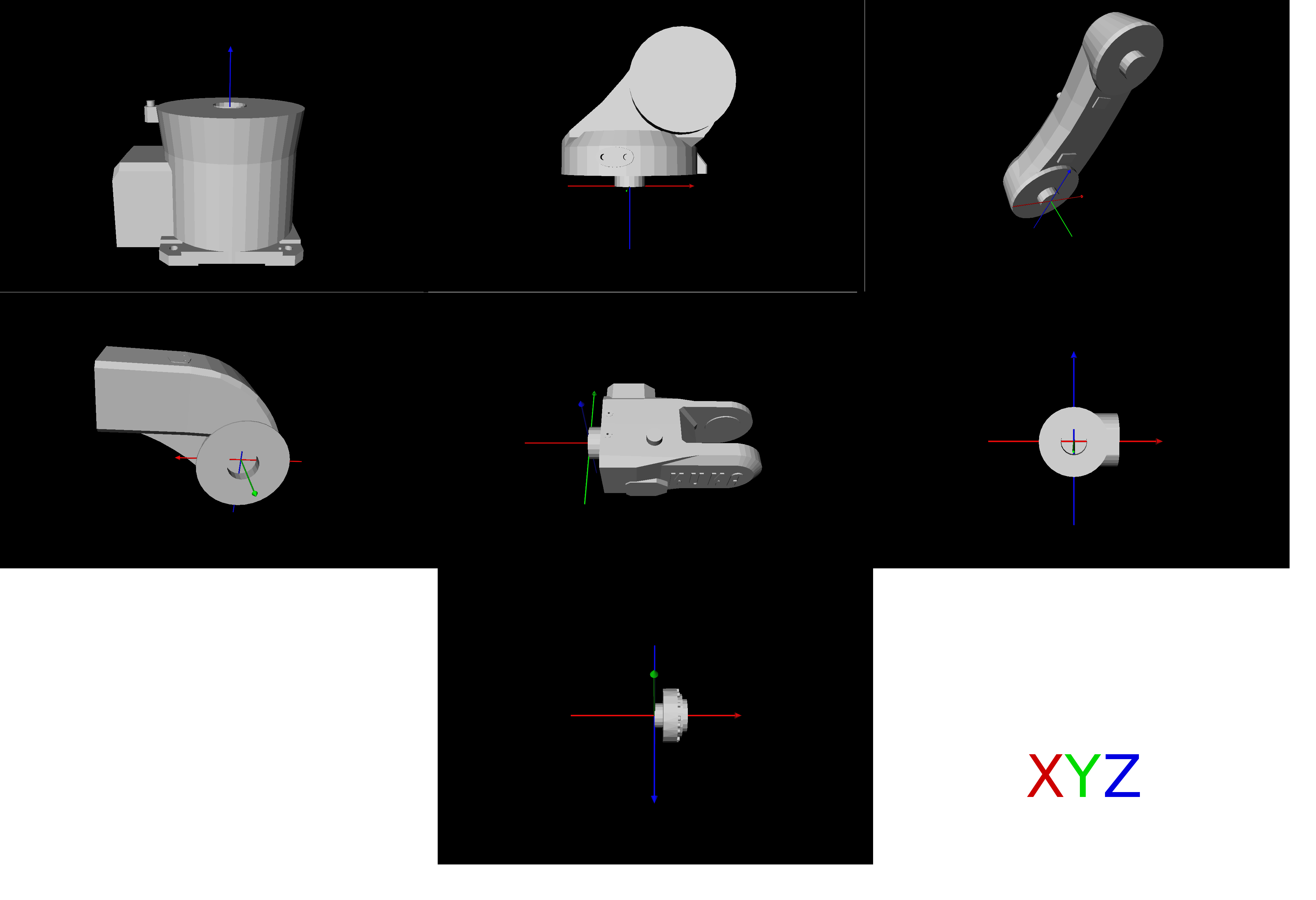 7. Next, we need to mess with the link models in order to position the local coordinate system (in the exported .iv files) at the right point and orientation. This is important because in the robot definition files, the joint rotations are specified around the axes of the local coordinate system. Unless the local coordinate system is in the right place in each link model, your robot links will go all over the place when you use the .rob file in MPK